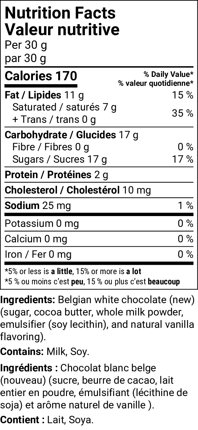 Ingredients: Belgian white chocolate (new) (sugar, cocoa butter, whole milk powder, emulsifier (soy lecithin), and natural vanilla flavoring)