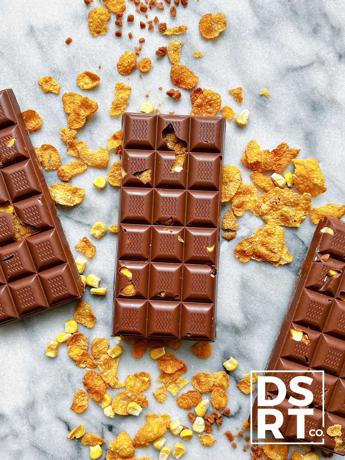 Belgian milk chocolate, toasted corn cereal, freeze dried sweet corn, toffee pieces and a sprinkle of sea salt. The result is a sweet, creamy, crunchy, slightly savory bar that will leave your taste buds intrigued and desperate for more (trust us!)