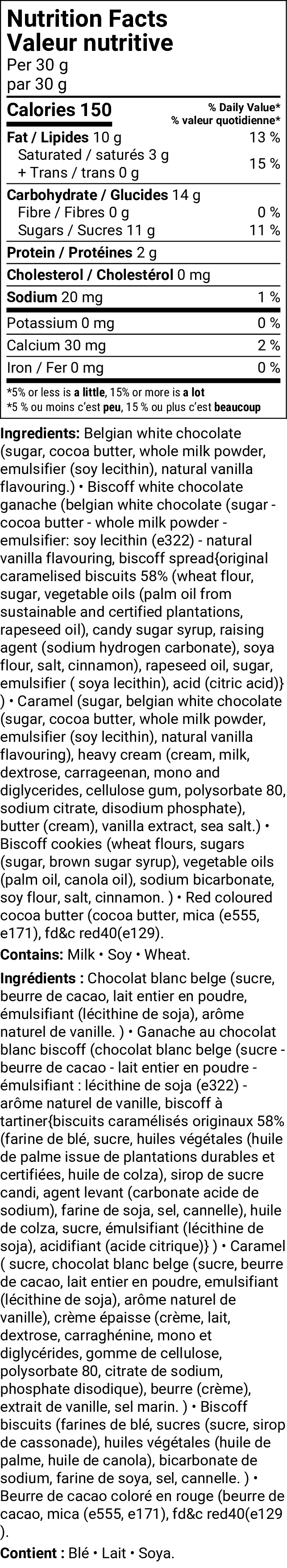 Ingredients: Belgian white chocolate (sugar, cocoa butter, whole milk powder, emulsifier (soy lecithin), natural vanilla flavouring.) • Biscoff white chocolate ganache (belgian white chocolate (sugar - cocoa butter - whole milk powder - emulsifier: soy lecithin (e322) - natural vanilla flavouring, biscoff spread{original caramelised biscuits 58% (wheat flour, sugar, vegetable oils (palm oil from sustainable and certified plantations, rapeseed oil), candy sugar syrup, raising agent (sodium hydrogen carbonate), soya flour, salt, cinnamon), rapeseed oil, sugar, emulsifier ( soya lecithin), acid (citric acid)} ) • Caramel (sugar, belgian white chocolate (sugar, cocoa butter, whole milk powder, emulsifier (soy lecithin), natural vanilla flavouring), heavy cream (cream, milk, dextrose, carrageenan, mono and diglycerides, cellulose gum, polysorbate 80, sodium citrate, disodium phosphate), butter (cream), vanilla extract, sea salt.) • Biscoff cookies (wheat flours, sugars (sugar, brown sugar syrup), vegetable oils (palm oil, canola oil), sodium bicarbonate, soy flour, salt, cinnamon. ) • Red coloured cocoa butter (cocoa butter, mica (e555, e171), fd&c red40(e129)