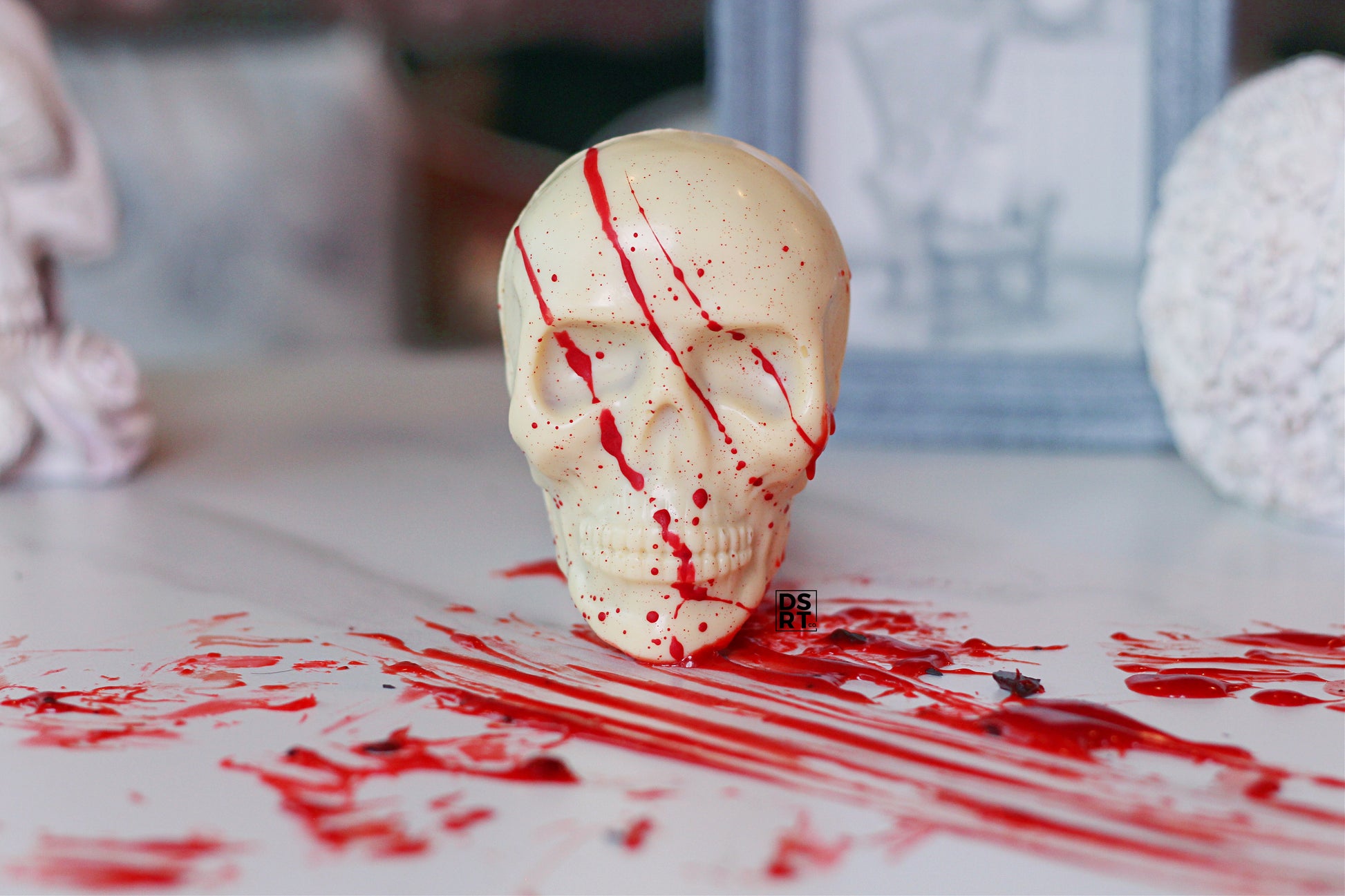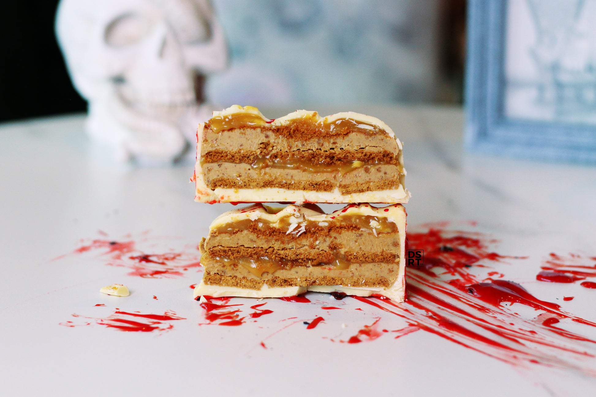 This show-stopping white chocolate skull is a biscoff lovers dream disguised as a nightmarish blood splattered skull. Perfect for summerween, halloween and every spooky night in between!