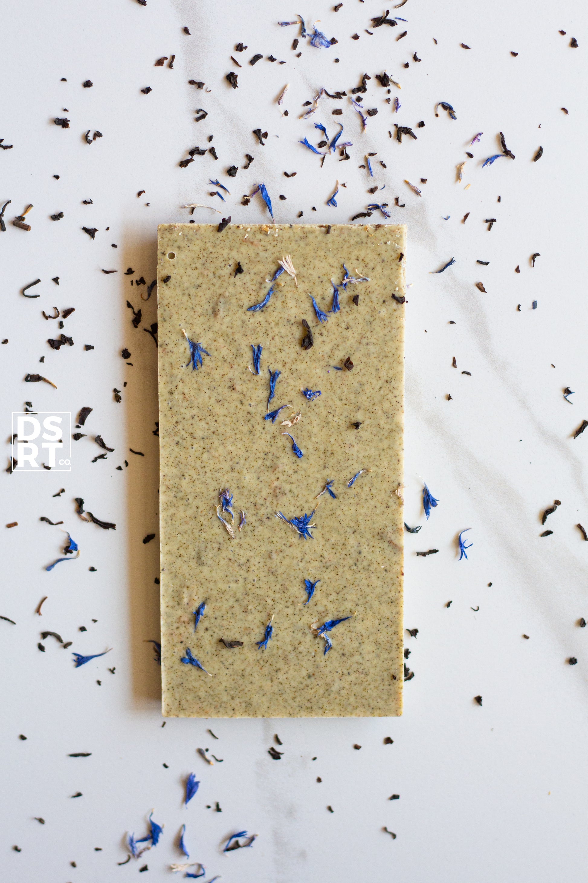 Belgian white chocolate with Tea at the Whitehouse blend of Cream Earl Grey Tea, toasted feuillitine pastry and cornflowers.