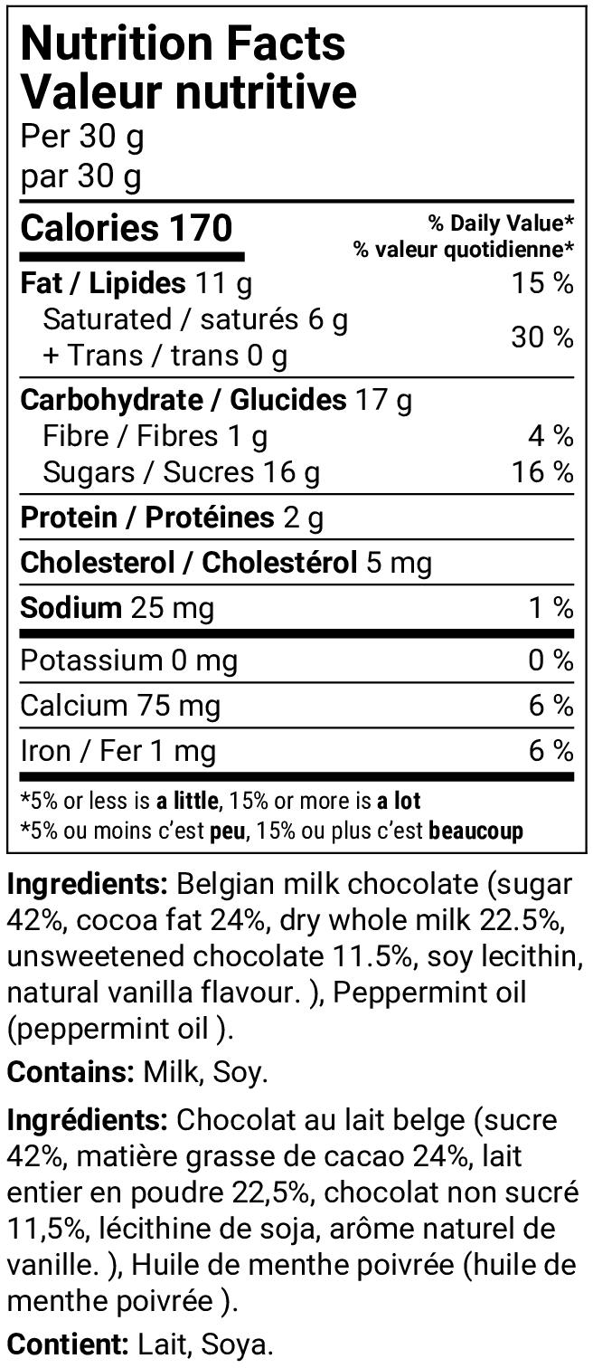 Ingredients: Belgian milk chocolate (new) (sugar, cocoa butter, whole milk powder, emulsifier (soy lecithin), natural vanilla flavouring ), Peppermint oil (peppermint oil )