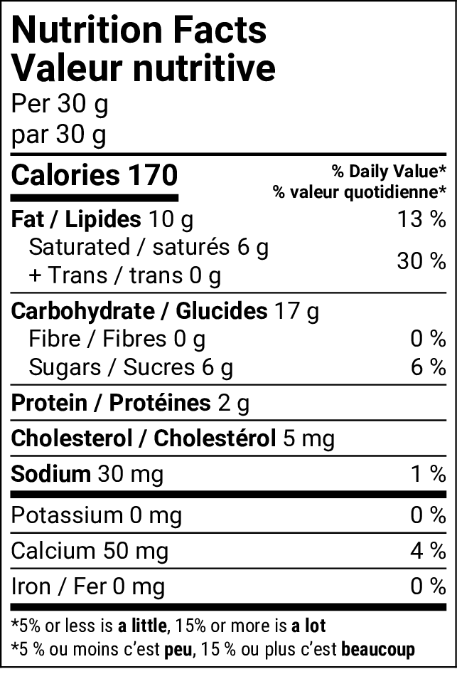Ingredients: Belgian white chocolate (sugar, cocoa butter, whole milk powder, emulsifier (soy lecithin), natural vanilla flavouring.) • Sugar cookie pieces (wheat flour, shortening (vegetable oil, modified palm oil), sugar, corn starch, butter, salt, milk, natural flavour) • Snowflake sprinkles (sugar, cornstarch, rice flour, palm oil, gum acacia. xanthan gum, titanium dioxide (colour), natural and artificial flavour mono and di-glycerides, polysorbate 60 ) • Mint oil based colouring (glycerol (e422), colouring (e171, e102, e133), lecithin (e322)) • Cake batter flavouring (alcohol, propylene glycol, water, natural and artificial flavours, glycerin )