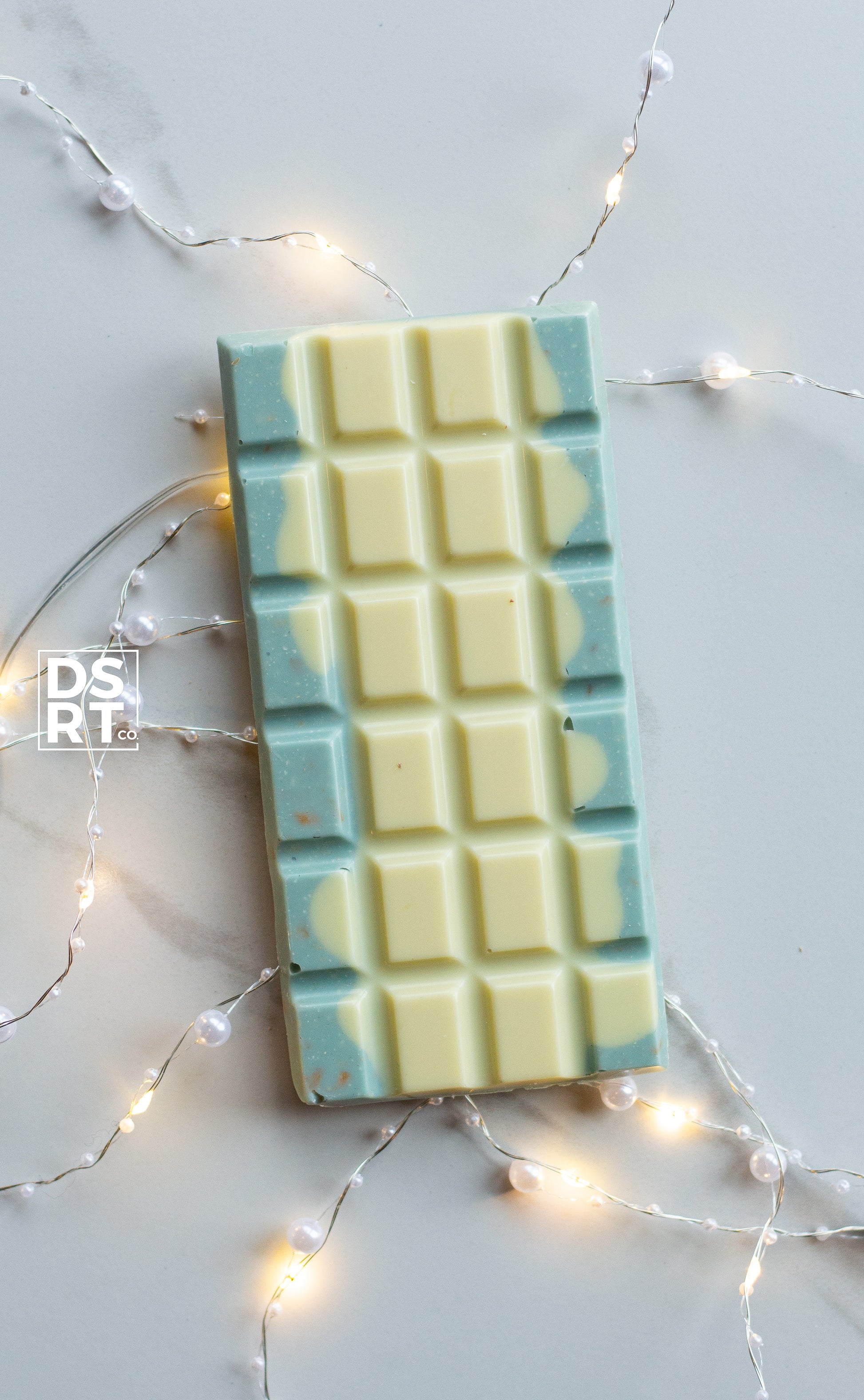This is a brand new bar for Holiday 2025! Inspired by a holiday necessity: a frosted sugar cookie with snowflake sprinkles. This bar is a Belgian white chocolate bar with sugar cookie pieces and snowflake sprinkles on the back in two beautiful tones that scream: SNOW DAY!