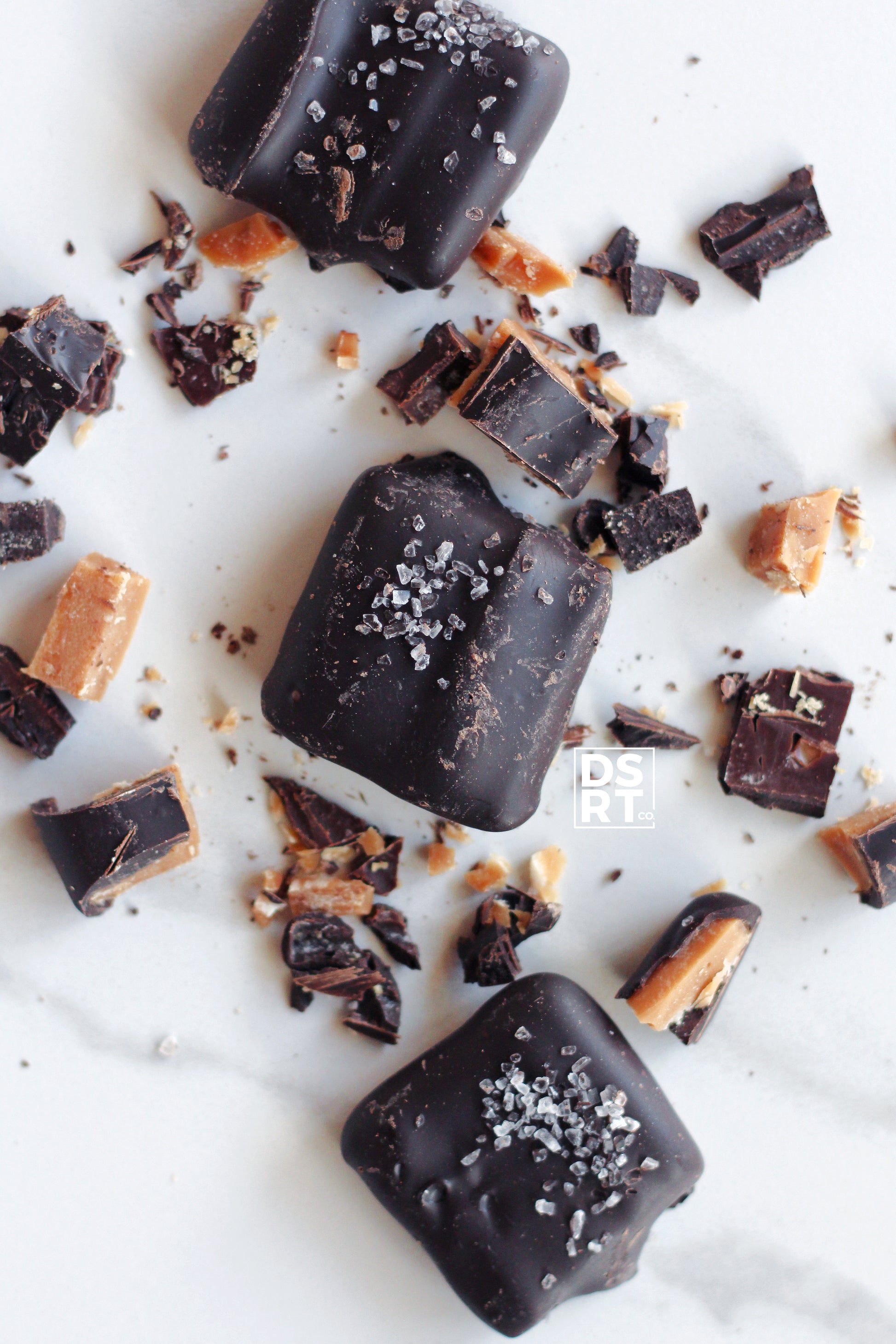 Dark chocolate covered toffee with sprinkle of sea salt on top.