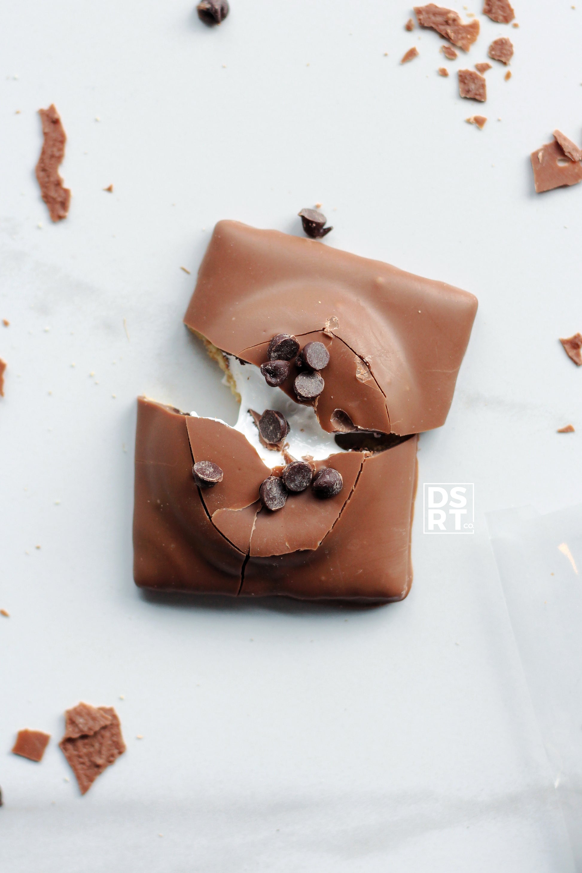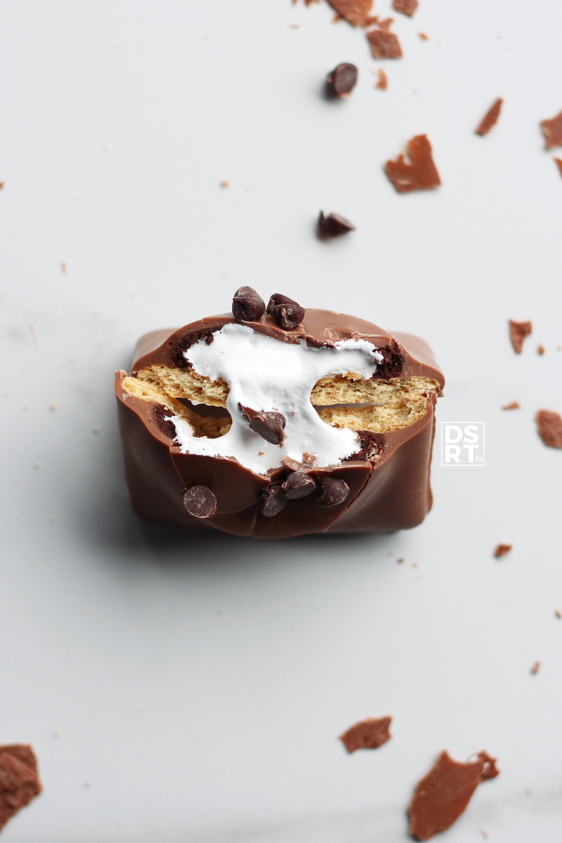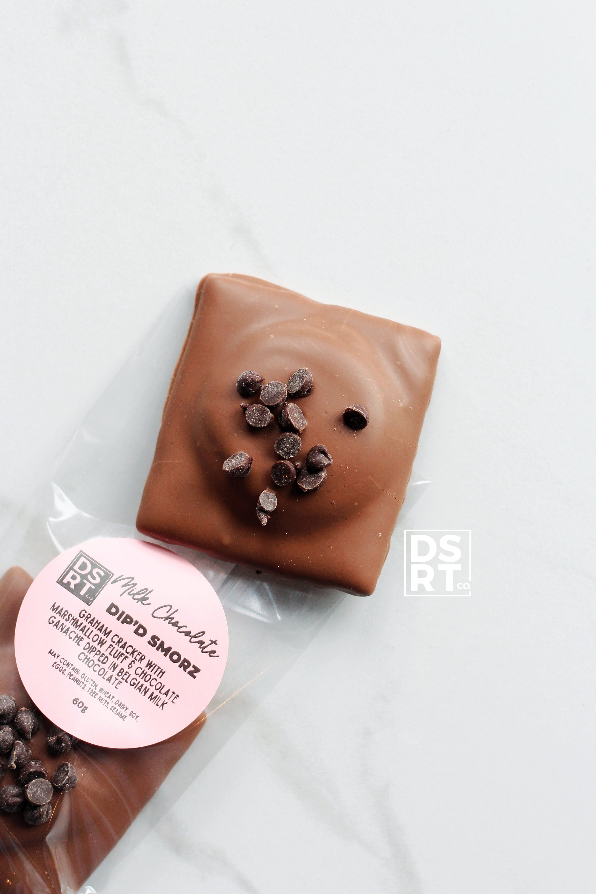 Craving our SMORZ bar but want a pocket-sized version? Cue the dipped SMORZ! Graham cracker topped with semi sweet chocolate ganache + marshmallow fluff then dipped in Belgian milk chocolate and topped with semi sweet chocolate chips.