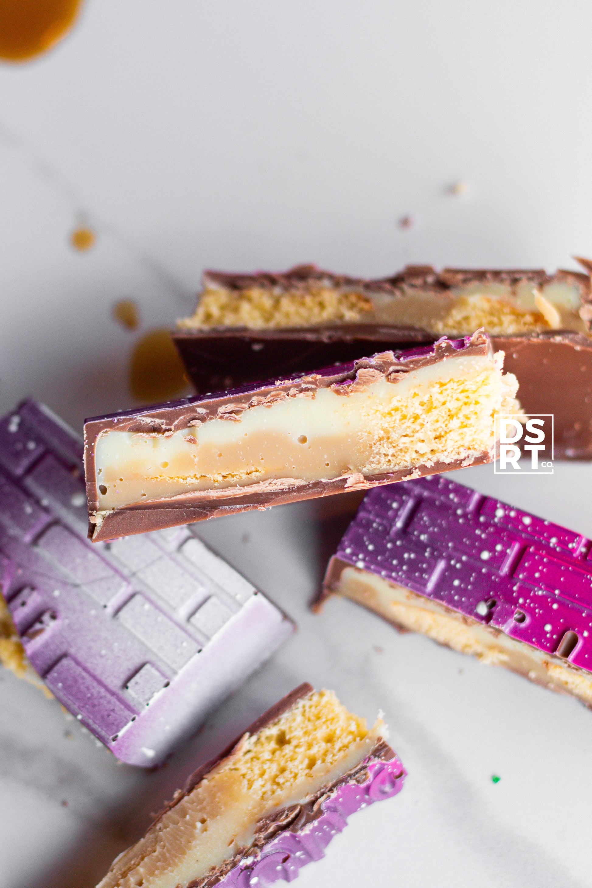 Tiramisu is a classic share-able dessert. Our chocolate bar take on the Italian classic involves our Belgian Milk chocolate, a white chocolate vanilla cream ganache, an espresso white chocolate ganache and Italian sponge cookies! Full of espresso flavour and a delicious soft bite from the sponge cookies. The outside of the bar is decorated to have a cocoa powder spray on top just like the original dessert.