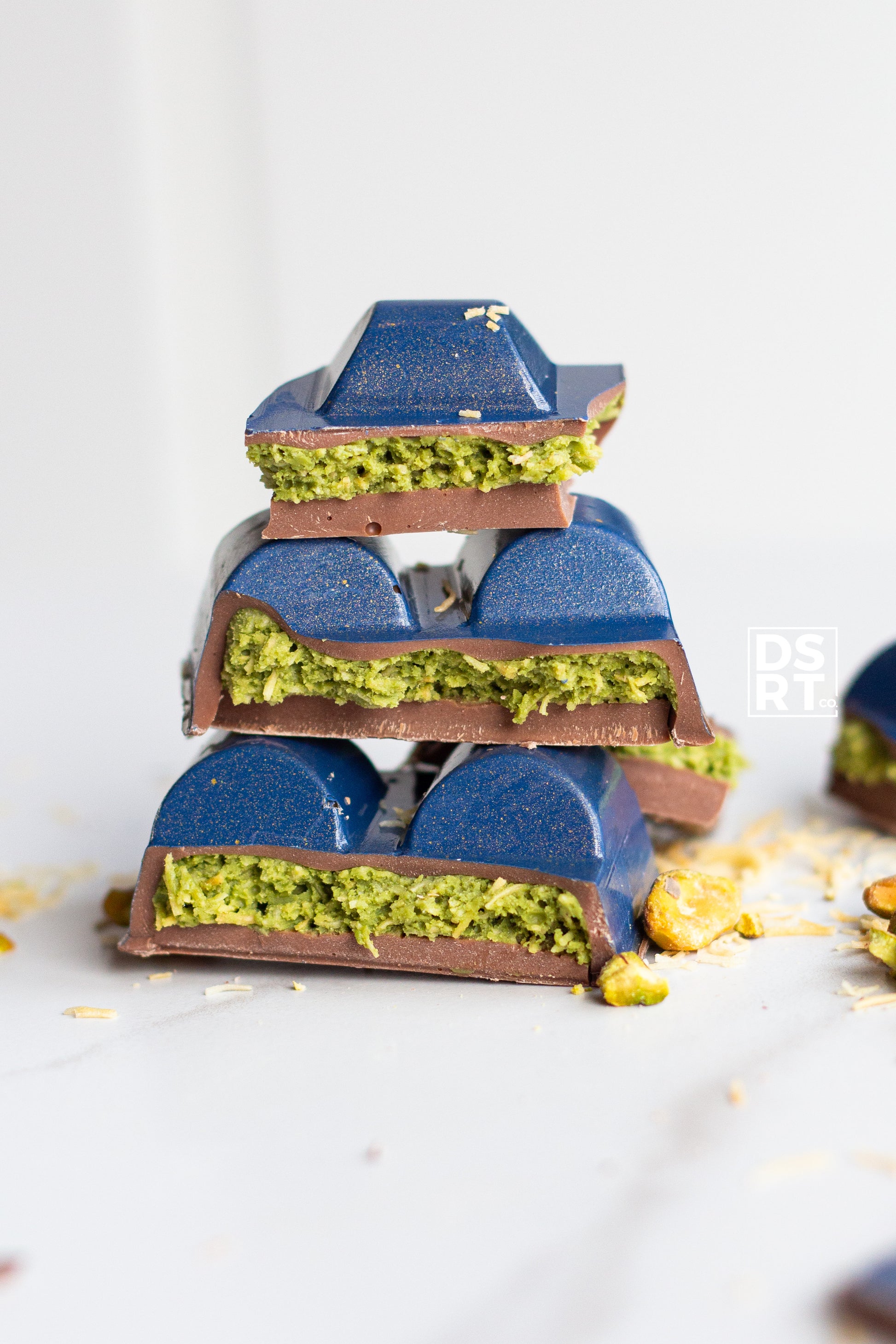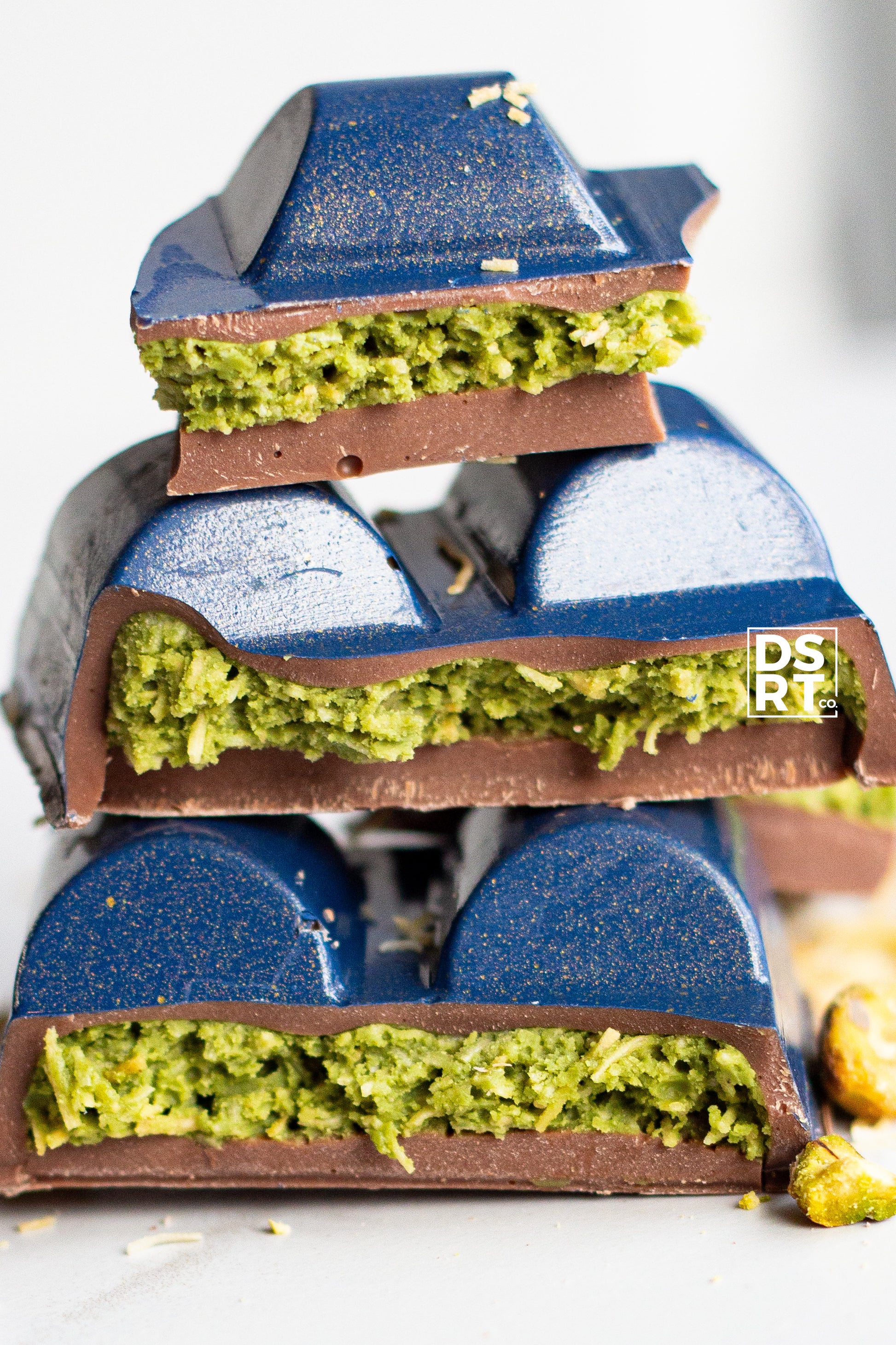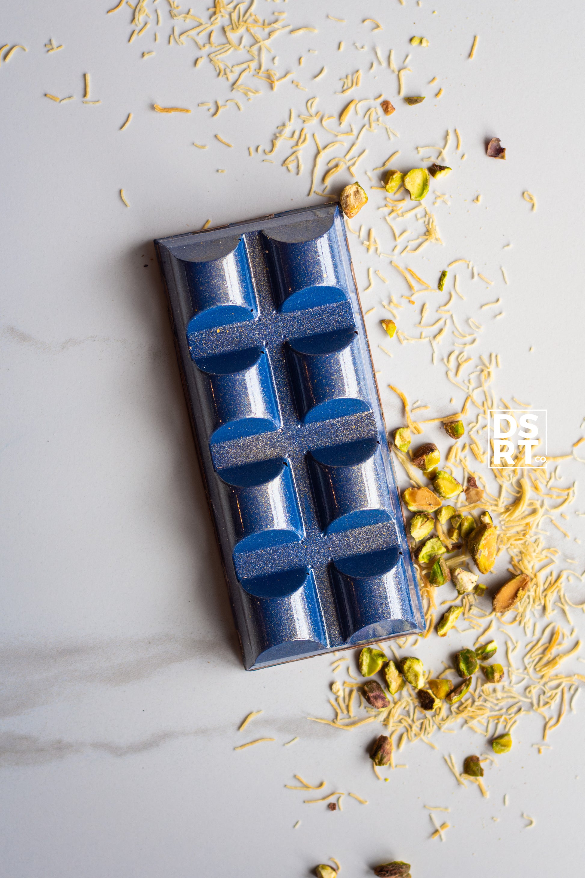 Ingredients: Belgian milk chocolate (sugar 42%, cocoa fat 24%, dry whole milk 22.5%, unsweetened chocolate 11.5%, soy lecithin, natural vanilla flavour.) • Dsrt co pistachio paste (toasted pistachios, white sugar, grapeseed oil, sea salt) • Belgian white chocolate (new) (sugar, cocoa butter, whole milk powder, emulsifier (soy lecithin), and natural vanilla flavoring) • Toasted kataifi pastry (wheat flour, water, corn starch, canola oil, sugars (dextrose), salt, wheat starch, sodium propionate, butter (cream).) • Green oil based colouring (glycerol (E422), canola oil, colours (E102*, E133), emulsifiers (E322. E433)) • Night blue cocoa butter (cocoa butter, FD&C blue 2 (E132), titanium dioxyde (ti02) (E171)) • Gold coloured cocoa butter (cocoa butter, mica (E555, t102), one or more of the following: fd+c lakes)