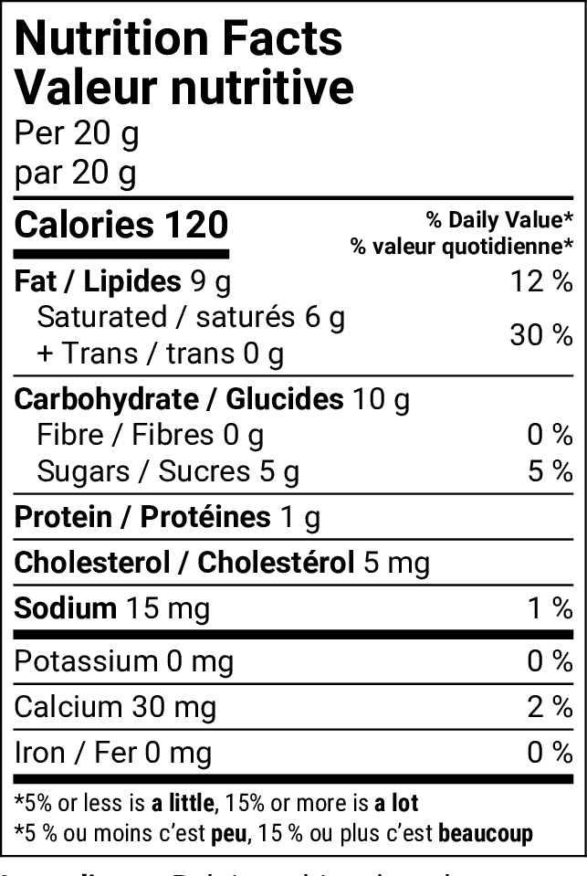 Ingredients: Belgian white chocolate (sugar, cocoa butter, whole milk powder, emulsifier (soy lecithin), natural vanilla flavouring.) • Belgian milk chocolate (new) (sugar, cocoa butter, whole milk powder, emulsifier (soy lecithin), natural vanilla flavouring ) • Coconut oil • Candy cane pieces (sugars (sugar, glucose syrup), natural flavour, allura red, tartrazine, brilliant blue, fcf, glycerin, canola oil, sunflower lecithin ) • Peppermint oil (peppermint oil )