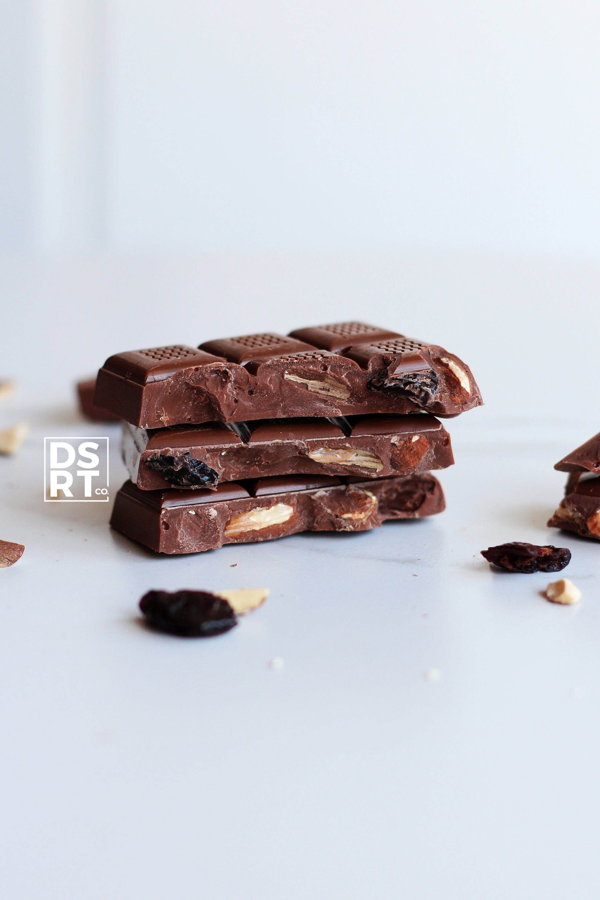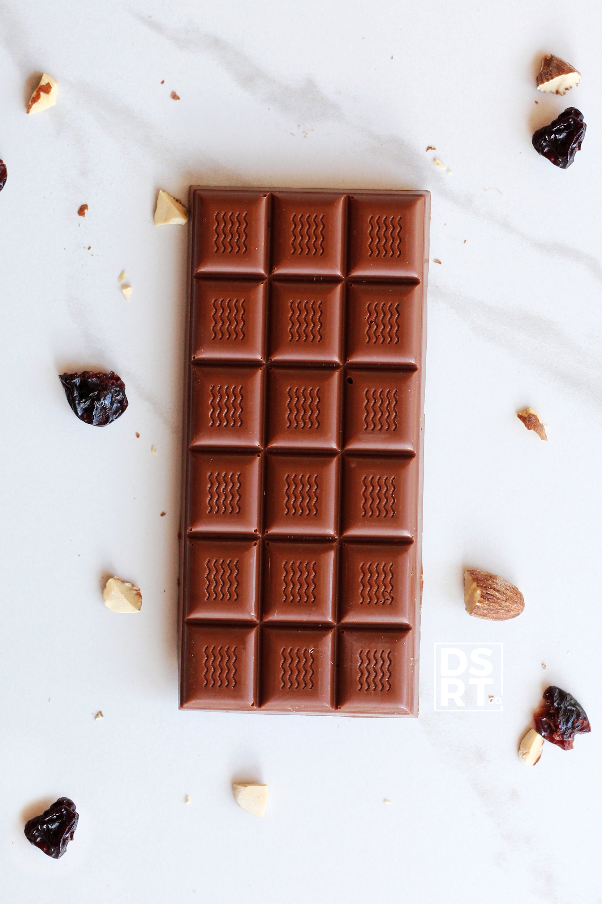 Ingredients: Vegan milk chocolate (sugar, cocoa butter, cocoa mass, chufa powder (16.5%), resistant dextrin, emulsifier, sunflower lecithin, natural flavourings ) • Toasted almonds • Dried montmorency cherries (cherries, sugar, sunflower oil)
