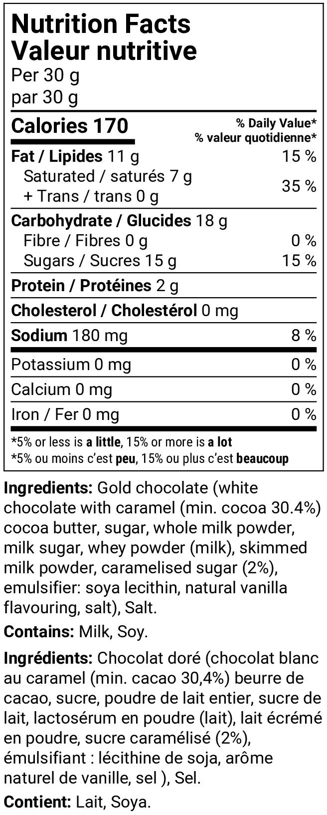 Ingredients: Gold chocolate (white chocolate with caramel (min. cocoa 30.4%) cocoa butter, sugar, whole milk powder, milk sugar, whey powder (milk), skimmed milk powder, caramelised sugar (2%), emulsifier: soya lecithin, natural vanilla flavouring, salt), Salt