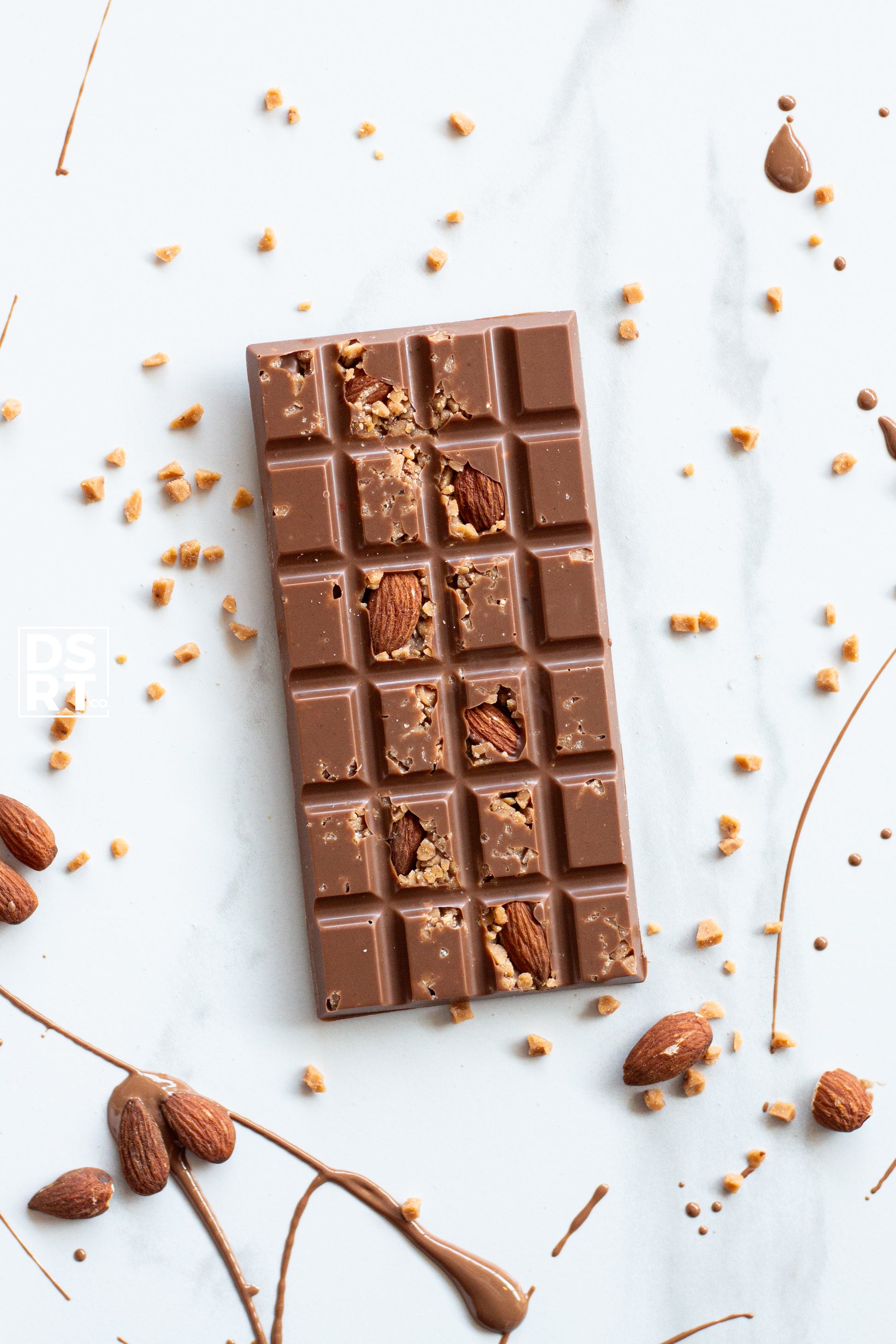 One day our landlord walked in and ordered a milk chocolate bar that had 'some sort of nut and maybe caramel?' and we agreed and said it would be ready tomorrow. We had no such thing on the menu but this little baby came together and it is so simple and delicious - it's a classic! Belgian milk chocolate, toffee pieces, roasted almonds + sea salt.