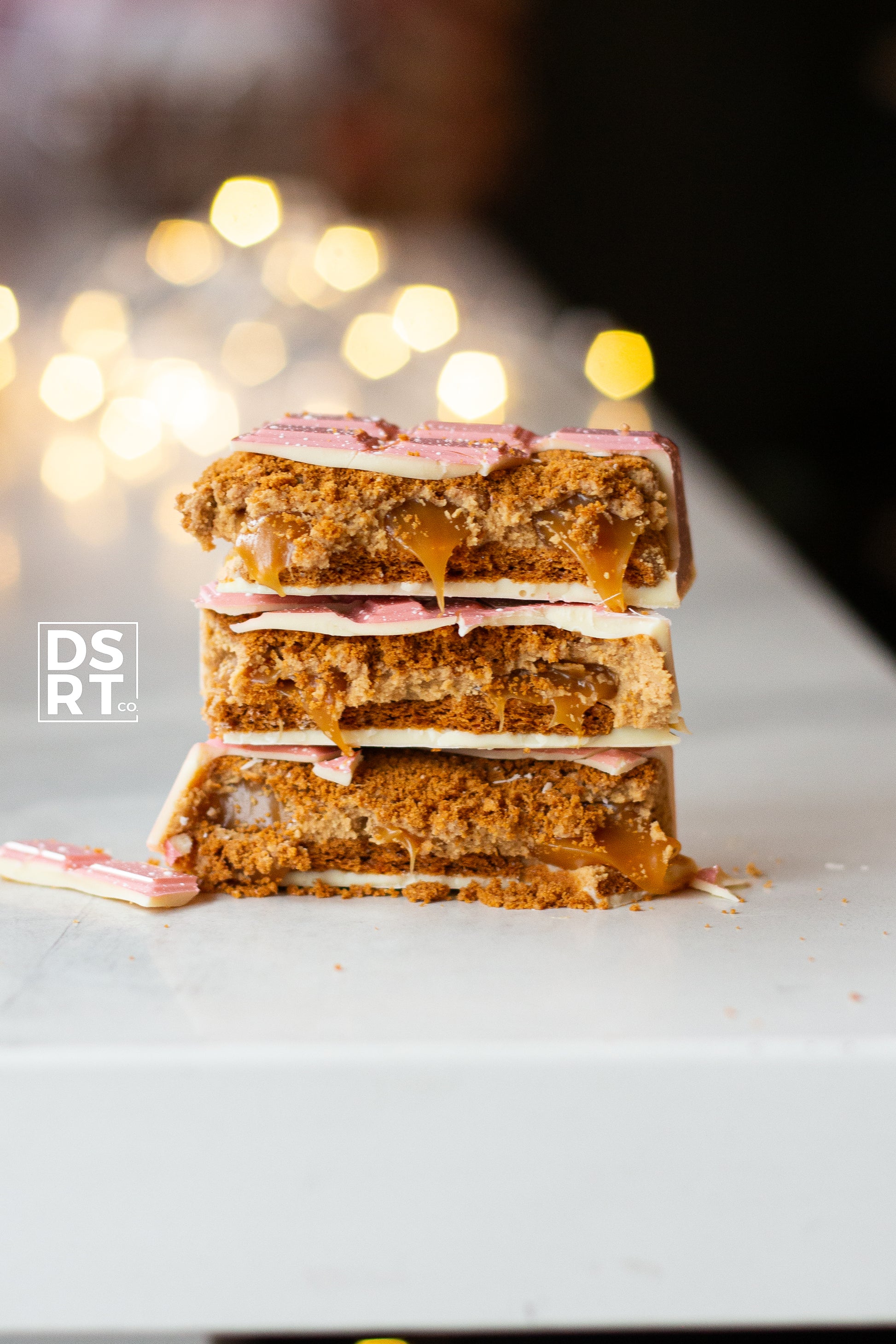 The Vanessa bar was created in honour of my friend Vanessa who loved biscoff and had a laugh that made the world a better place. We think this bar has that effect, too. Creamy biscoff fudge, caramel and biscoff cookies encased in a white chocolate shell? Perfection. She is here to bring a bit of holiday cheer to your life this season.